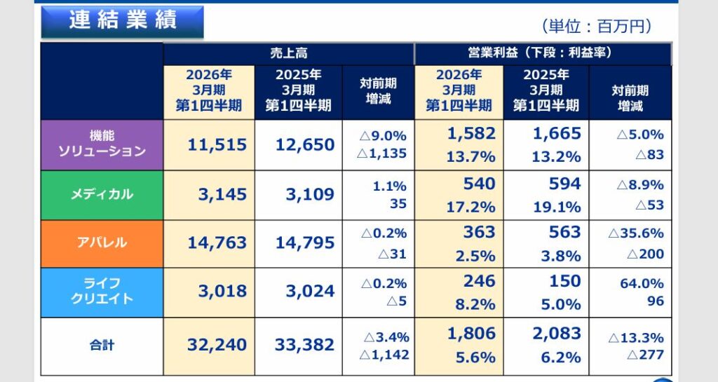 これは先日発表された2026年3月期第1四半期連結決算を受けてのことで、減収大幅減益だった。