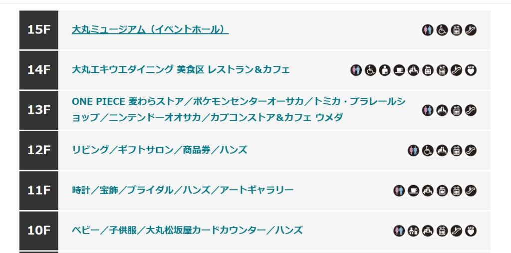 ちなみに、2025年8月時点での大丸梅田店の10~15階のフロアマップは以下のようになっている。