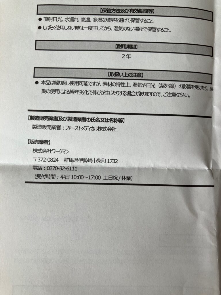 ちなみにメディヒールには、注意点などが書かれたA4サイズの別紙が同封されているが、これによると耐用期間は2年とのことである。また製造業者はファーストメディカル(株)とのことだ。