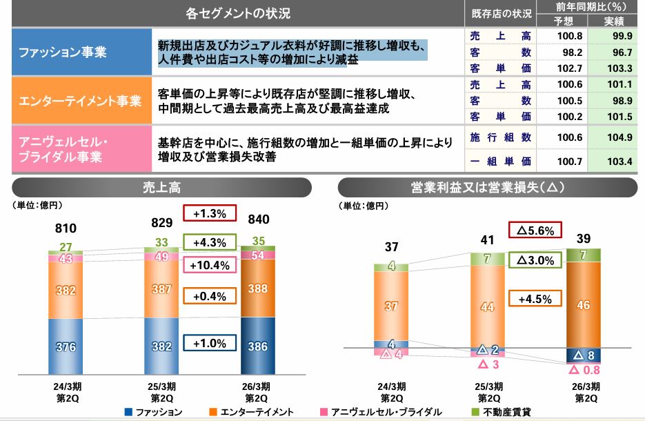 ファッション事業は、前期比1・0%増の売上高386億円に留まっている一方で、8億円の営業損失(要するに赤字)を出している。営業利益のほとんどをエンターテイメント事業で稼いでいる。